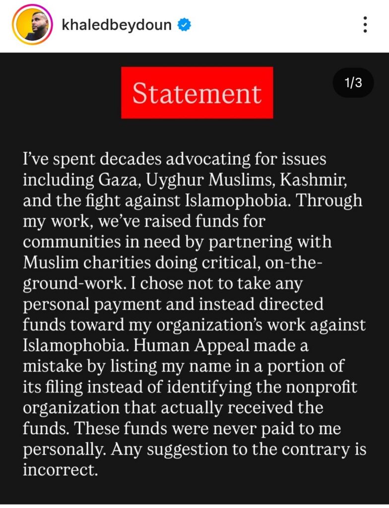 Human Appeal USA a publié une déclaration affirmant qu’une erreur matérielle avait été commise dans les comptes et que les fonds étaient destinés à l’organisation islamophobe de Beydoun plutôt qu’à lui personnellement.