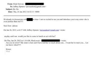 Dans un e-mail d’Al-Owais à Epstein, elle a écrit : « Bonjour, déjà en discussion avec (expurgé) à temps – je suis tellement excitée de vous voir et de vous présenter ma sœur – elle est encore plus jolie que moi ! »
