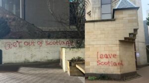 Le graffiti, peint avec de la peinture en aérosol rouge, disait « quittez l’Écosse » et « sortez d’Écosse ». et a été pulvérisé à l’arrière de la mosquée, où se trouve un parking.