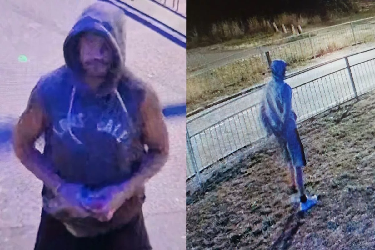 L’un est décrit comme blanc, dans la trentaine, avec une moustache, et de construction musculaire, portant un pantalon noir et un pull Lonsdale sans manches gris.