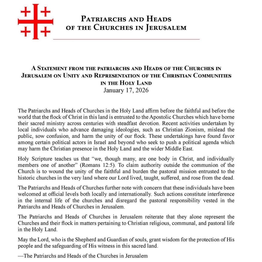 Les patriarches et chefs d’Églises de Terre Sainte ont affirmé dans un communiqué publié samedi que les récentes activités d’individus locaux promouvant « des idéologies préjudiciables, telles que le sionisme chrétien », qui induisent le public en erreur, sèment la confusion et nuisent à l’unité de notre troupeau.