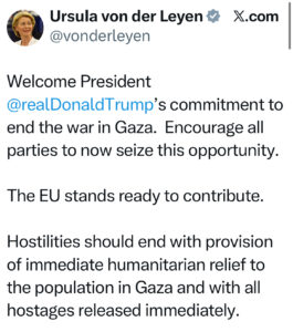 Le président de la Commission européenne, Ursula von Der Leyen, a déclaré sur X que «le plan de Gaza du président Trump offre la meilleure chance immédiate de mettre fin à la guerre» et que «l’UE est prête à l’aider à réussir».