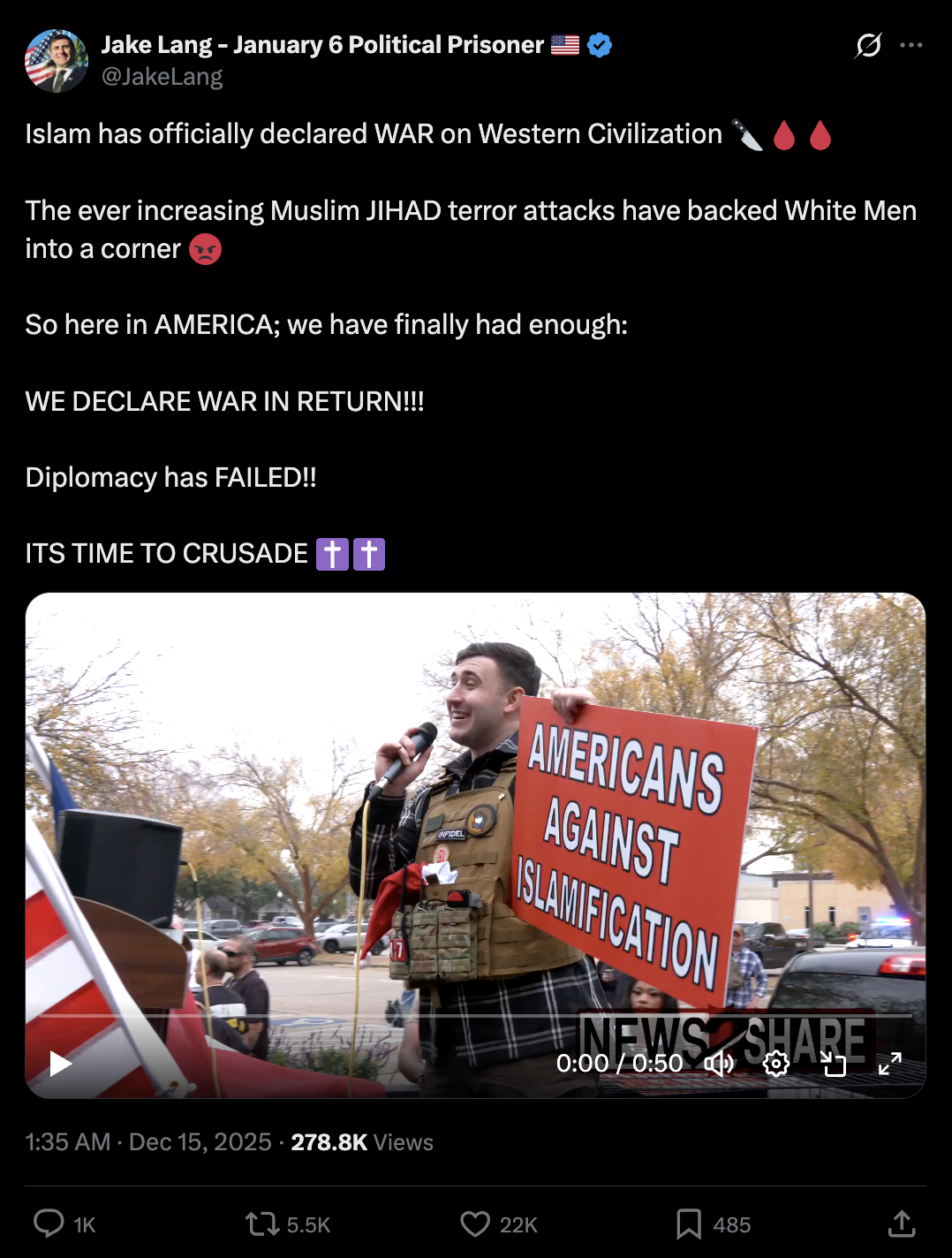Il est apparu lors de manifestations organisées par des groupes fortement opposés à l’islam et à l’immigration musulmane, et a partagé des messages en ligne mettant en garde contre ce qu’il décrit comme la « menace » de l’islam en Occident. Lang a souvent décrit les musulmans comme des « violeurs » et des « fidèles pédophiles ».