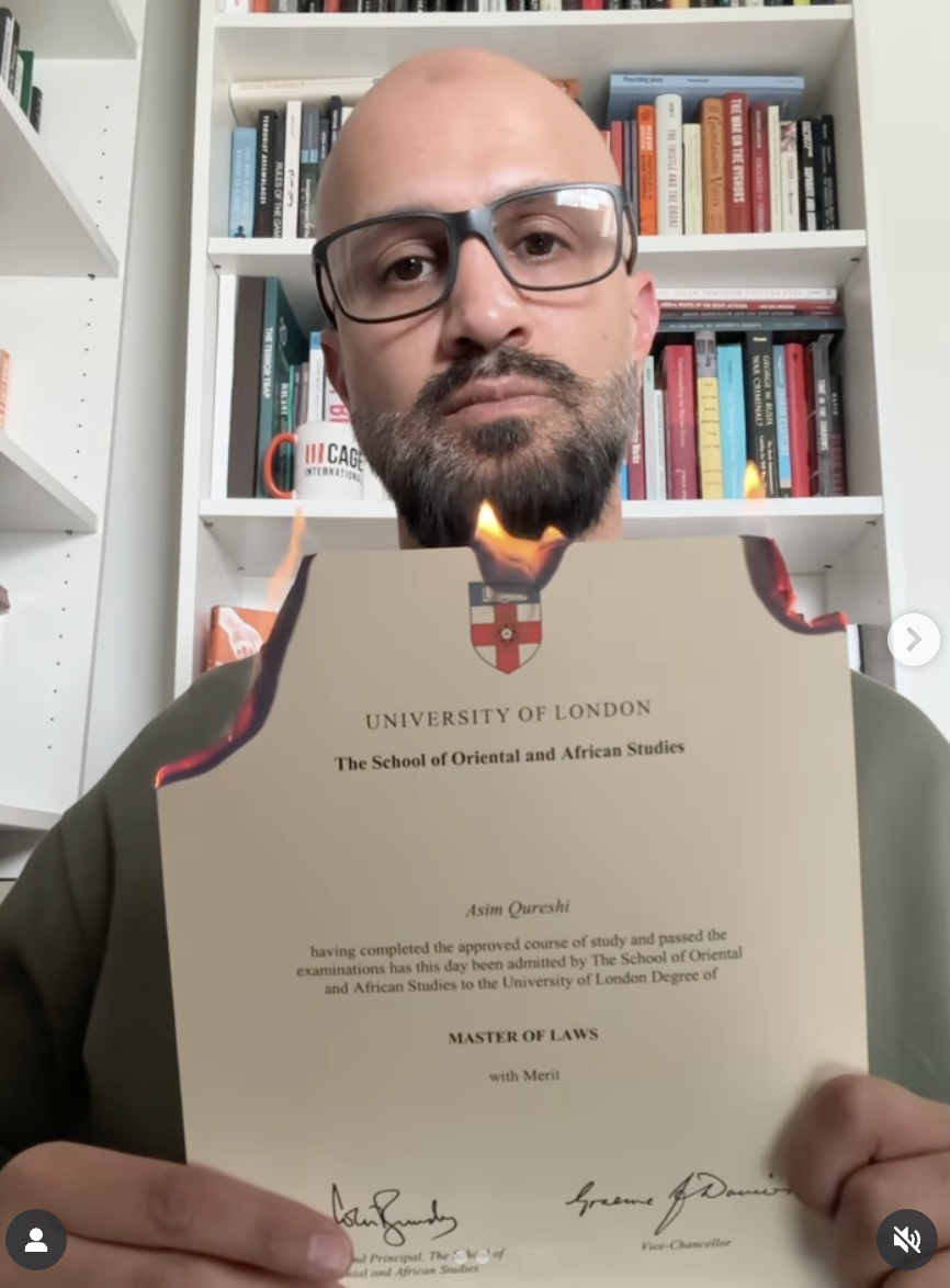 En solidarité, auteur musulman éminent et directeur de recherche de Cage International, le Dr Asim Qureshi, a publié une vidéo sur Instagram qui lui montre brûler son propre certificat SOAS Masters.