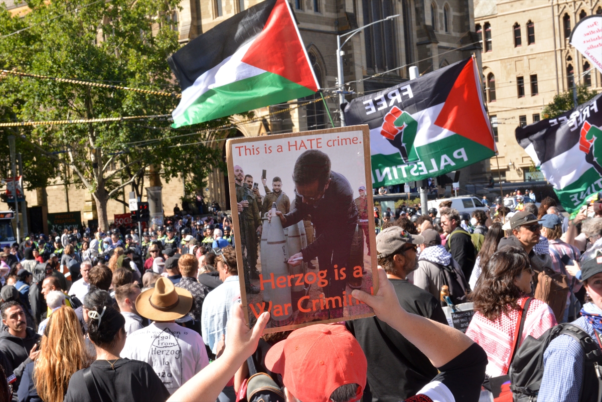 Des milliers de personnes se sont rassemblées à Melbourne ce matin alors que Herzog arrivait dans la ville avant la dernière étape de son voyage. Cette manifestation marquait la quatrième journée consécutive de manifestations qui le suivaient dans les grandes villes australiennes.