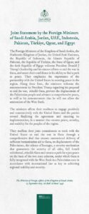 Quant à la réaction étrangère des autres pays musulmans et arabes, l’Arabie saoudite, la Jordanie, les Émirats arabes unis, le Pakistan, la Turquie, l’Indonésie, le Qatar et l’Égypte ont toutes accueilli le plan et ont annoncé leur volonté de coopérer pour l’appliquer.