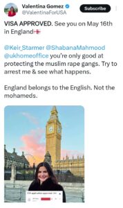 Après l’approbation initiale de son ETA, dans un post sur X, Gomez a déclaré : « VISA APPROUVÉ. Rendez-vous le 16 mai en Angleterre. Keir Starmer, Shabana Mahmood et le ministère de l’Intérieur du Royaume-Uni, vous n’êtes bons qu’à protéger les gangs de violeurs musulmans. Essayez de m’arrêter et voyez ce qui se passe. L’Angleterre appartient aux Anglais. Pas aux Mohamed. »