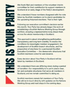 Les 12 membres du Comité exécutif intérimaire écossais (ISEC), composé de bénévoles, ont accusé la direction britannique de Your Party d’avoir une « attitude dédaigneuse » à l’égard de l’Écosse.